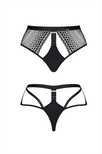Panty provoziert zu spannenden Spielen. An den Seiten aus wunderschöner schwarzer Spitze. Auf der Vorder- und Rückseite befindet sich eine auffällige Komposition aus schwarzen Gummibändern. Sie verfügen über silberfarbene Zierversteller aus Metall mit einer Funktion zur vertikalen Regulierung der Gummibänder. Der Rücken provoziert zu sinnlichen Spielen durch schön entblößte Gesäßbacken.