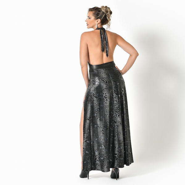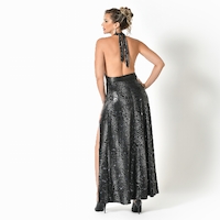 Hochelegantes Abendkleid aus gemustertem Fließstoff mit langen Beinschlitzen und Neckholder.