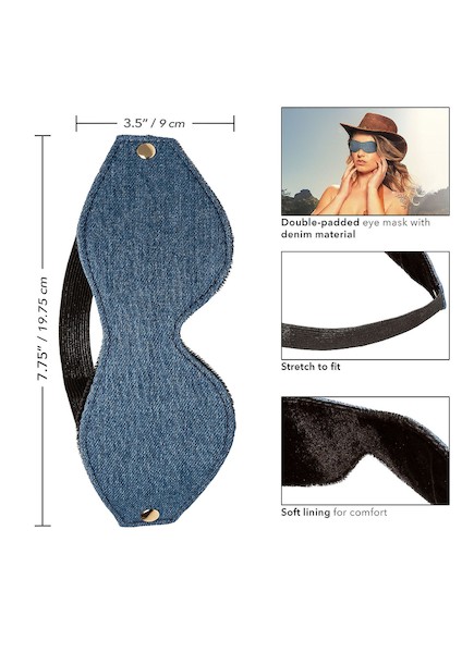 Ride 'em Premium Denim Collection Eye Mask, gefertigt für luxuriöse sensorische Erfahrungen. Doppelt gepolstertes Design sorgt für Komfort und Lichtblockierung für sensorisches Deprivationspiel. Weiches, dehnbares Denim-Material bietet eine eng anliegende, maßgeschneiderte Passform für alle. Perfekt für Bondage, Rollenspiele oder um Überraschung in intime Begegnungen zu bringen. Stilvolles Denim-Aussehen verleiht der Spielzeit Raffinesse und Aufregung. Genießen Sie erhöhte Sinne und umarmen Sie die Dunkelheit für endlose Erkundungen.