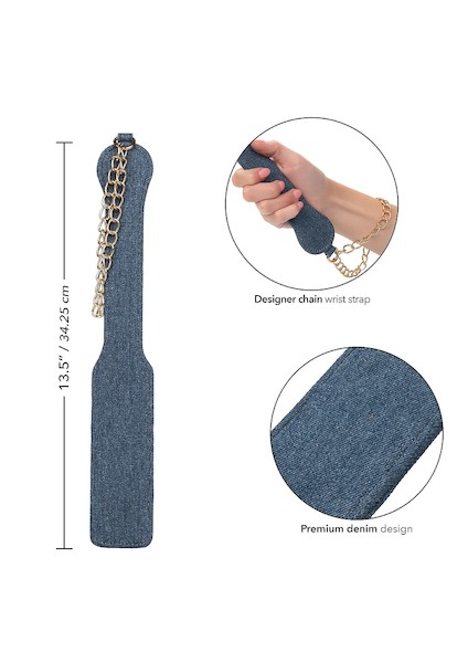 Ride 'em Premium Denim Collection Paddle, kombiniert Langlebigkeit und Raffinesse für verbesserte sensorische Erfahrungen. Hergestellt aus hochwertigem Denim, intensiviert seine einzigartige Textur jeden Schlag für maximales Vergnügen. Die solide Konstruktion gewährleistet zuverlässige Leistung, während die Designerketten-Handgelenksschlaufe Eleganz und Griffigkeit für die Kontrolle während des Spiels hinzufügen. Vielseitig für Anfänger und Enthusiasten gleichermaßen, hebt diese Paddel das Aufprallspiel auf, indem es einlädt, Macht-Dynamiken zu umarmen und unvergessliche Momente des Vergnügens zu schaffen.