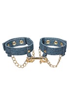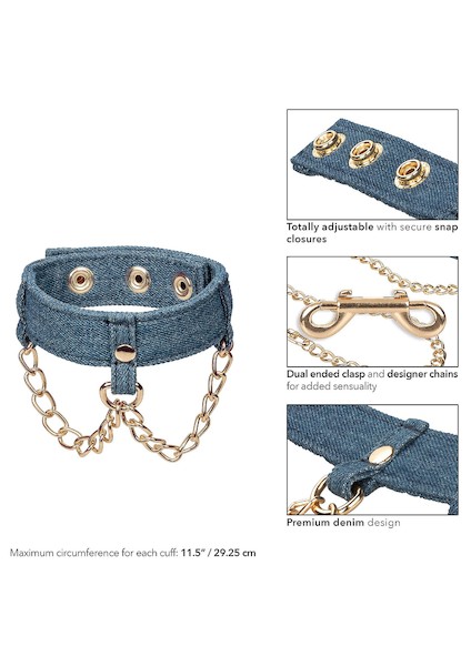 Ride 'em Premium Denim Collection Knöchel-Fesseln, verschmelzen Stil und Zurückhaltung für BDSM-Spiel. Verstellbar mit sicheren Druckknöpfen, sorgen sie für Komfort und Vielseitigkeit mit doppelseitigen Verschlüssen und D-Ringen. Hergestellt aus weichem Denim mit Designerketten für Sinnlichkeit, bieten sie Zuverlässigkeit und Mode. Ob Anfänger oder erfahrener Spieler, diese Fesseln laden zur Erkundung von Macht-Dynamiken ein und schaffen unvergessliche Momente des Vergnügens und der Hingabe.