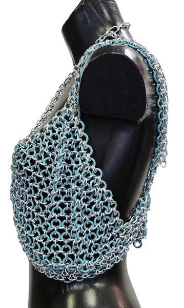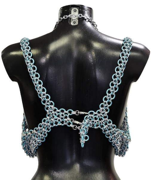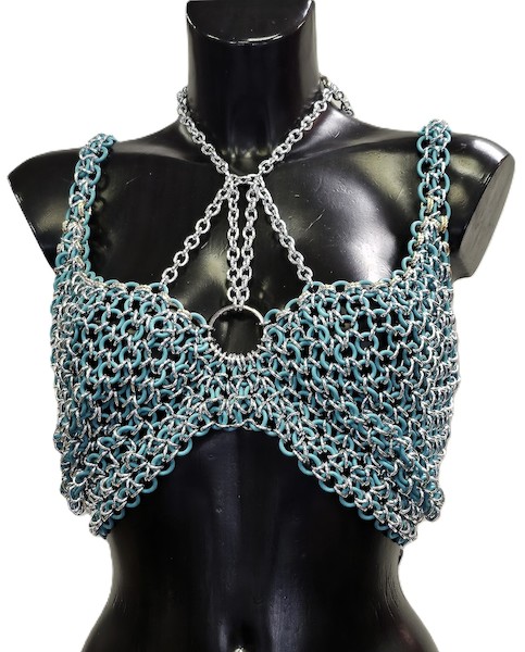 Wundervoller Ketten-BH aus silbernen Metallringen und grün türkisen flexiblen Latexringen mit breiteren Trägern und silbernem Neckholder. Bestens geeignet für große Brüste. Im Rücken und Nacken einstellbar.