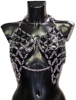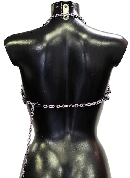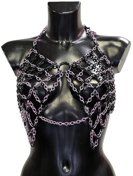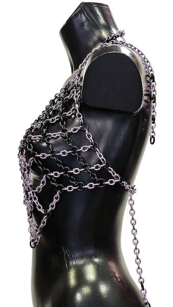 Fantasievolles Kettenoberteil aus lalafarbenen Metallringen und schwarzen flexiblen Latexringen. Vorn ein präsenter schwarer Zierring. Im Rücken und Nacken zu verstellen.