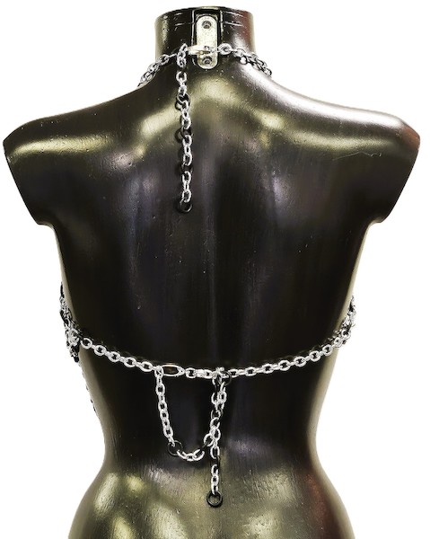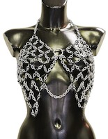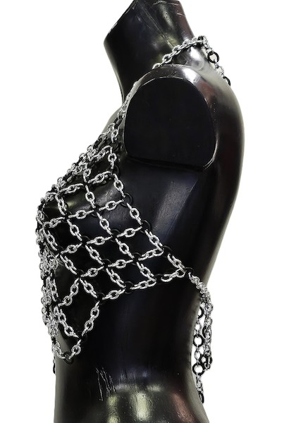 Wunderschönes Ketten-Top aus silbernen Metallringen und felxiblen schwarzen Latexringen. Verstellbar im Nacken und Rücken mit zentralem Ring im Decolleté.