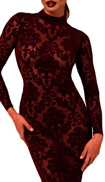 Betonen Sie Ihre Eleganz mit diesem figurbetonten Midikleid aus luxuriösem burgunderfarbenem Flocktüll. Es vereint raffinierten Stil mit subtiler Verführung und ist perfekt für besondere Anlässe und elegante Abende.