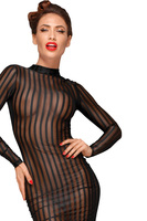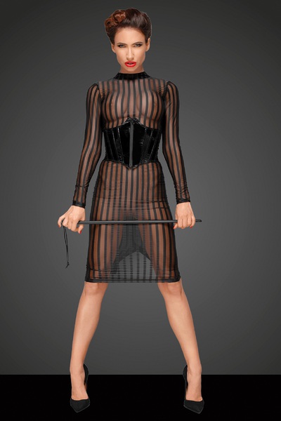 Atemberaubendes Kleid aus elastischen und sehr weichem Tüll. Der zarte Kragen ist mit einem Knopf versehen. Der besonders heiße Ausschnitt auf der Rückseite hat einen Spitzenbesatz.