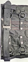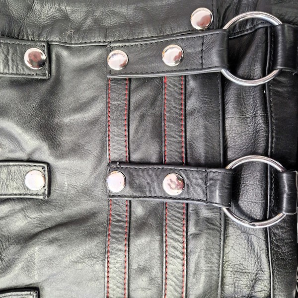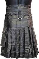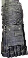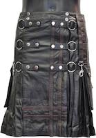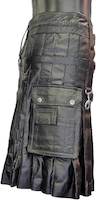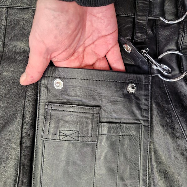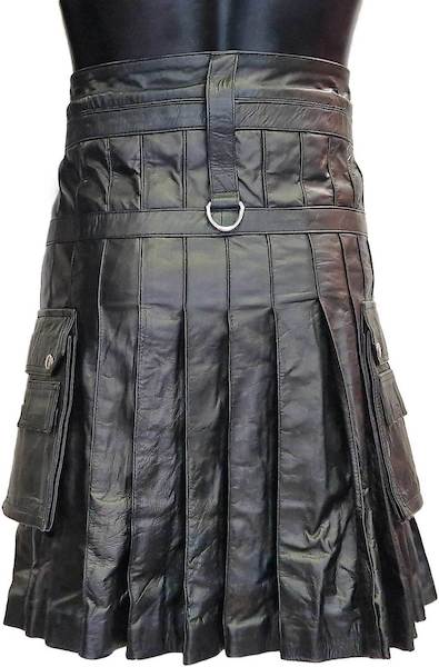 Langer Männerkilt aus Rindsnappaleder mit seitlichen Cargotaschen, roten Nähten und Gürtelschlaufen. Zu schließen mit Druckknöpfen und Schnallen.