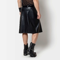 Wadenlanger Herrenkilt aus weichem Kunstleder und Schwarrzlack mit Druckknöpfen und Gürtelschlaufen.