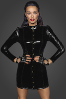 Kurzes PVC-Kleid mit gepufften Schultern und langen Ärmeln, vorne vom Kragen bis zum unteren Saum mit goldenen Schnallen geschlossen. Ein klassischer und trendiger Look, perfekt für jede Party.