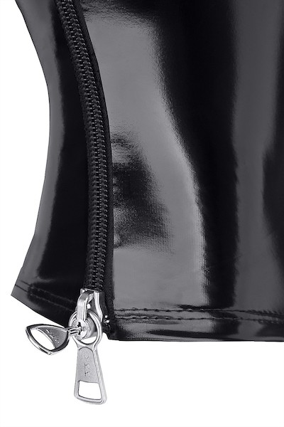 Die Maske besteht aus flexiblem und glänzendem Vinyl. Auf der Vorderseite befindet sich ein vertikaler Zierstreifen in schwarz-roter Zebrafarbe.