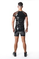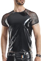 T-Shirt aus glänzendem, elastischem PVC. Ärmel aus schwarzem, sehr elastischem Mesh. Das Design des Shirts und die Kombination dieser beiden Materialien unterstreichen die Qualitäten der männlichen Silhouette fantastisch. Sie vergrößern optisch den Brustbereich und die Schulterlinie. Mittlerweile wirkt die Taille schlanker. Dank dieser Lösungen wirkt die Silhouette muskulöser.