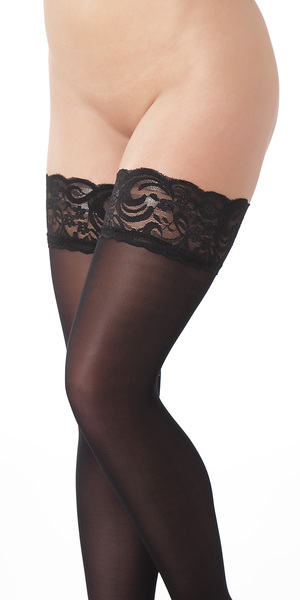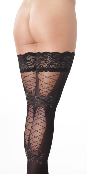 Halterlose Strümpfe mit Spitzenbündchen und Schnüroptik hinten.
