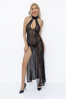 Langes Kleid aus zartem Leoparden-Flock mit hohem Vorderschlitz und offenem Rücken. Absolut unverzichtbar für jede Frau, die sich elegant und hinreißend zugleich fühlen möchte.