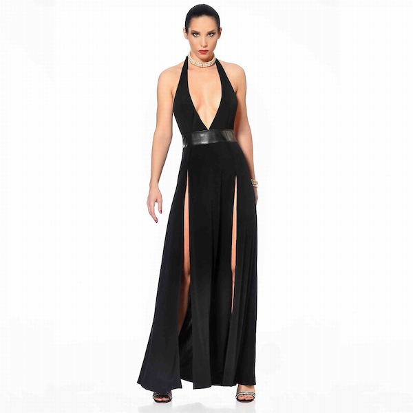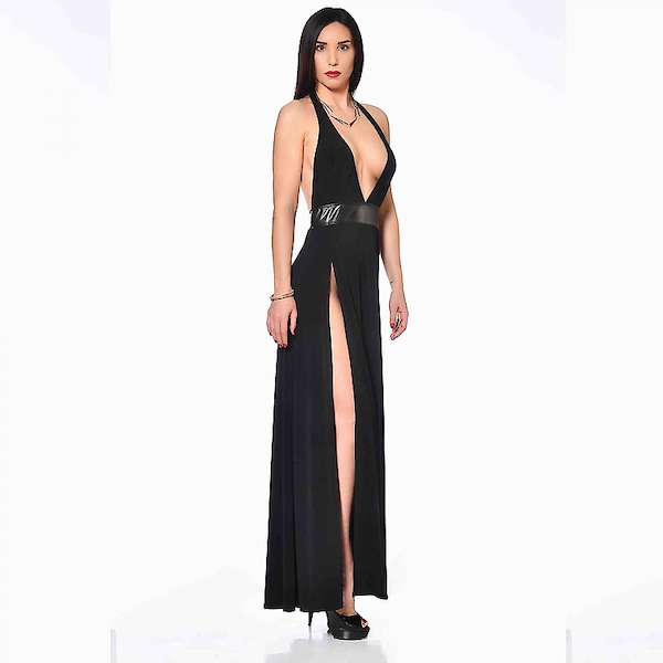 Herrliches Abendkleid mit Neckholder aus fließendem weichen Stoff mit zwei hohen Beinschlitzen und tiefem Rückenausschnitt.