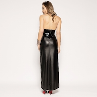 Atemberaubendes Abendkleid aus fließendem Wetlook mit langem Beinschlitz, Neckholder und Schnürmiederteil aus schwarzem Lack