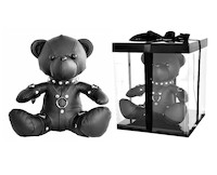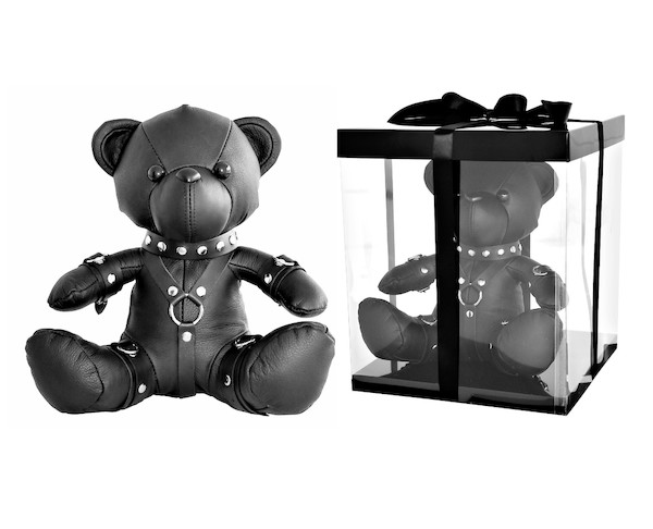 Handgefertigter, knuddeliger, süßer SM-Bär aus echtem Rind-Leder mit abnehmbaren BDSM-Nietenbändern in Geschenk-Plastik-Box Größe des Bären: Höhe 31cm, Breite 28cm, Tiefe 21cm
