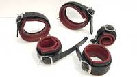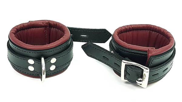 Qualitativ hochwertige Fußfesseln aus Rindsleder mit vierfach vernieteten D-Ringen und Ösen-Schnalle für Vorhängeschlösser (nicht enthalten). Weiche, bordeaux-farbene Innenpolsterung. Im Umfang zu verstellen von ca. 26 bis 43 cm.