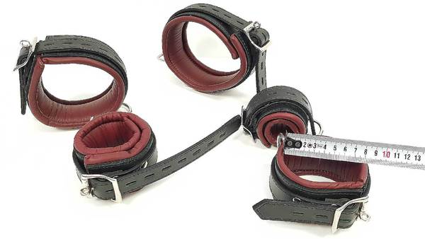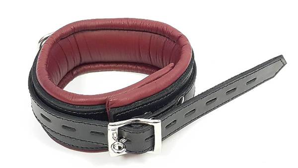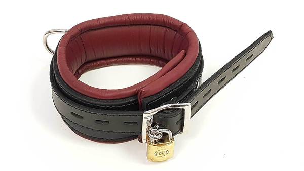 Hochwertige gepolsterte Halsfessel aus schwarzem, bordeaux-farbig abgesetztem Rindsleder mit vierfach vernietetem D-Ring. Mittels Schnalle kann die Fessel innerhalb von ca. 33 bis 52 cm Umfang verstellt werden. Die Schnalle hat eine Öse, an welche ein Schloss angebracht werden kann.
