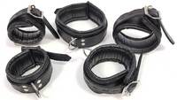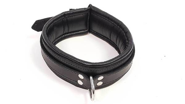 Hochwertige gepolsterte Halsfessel aus schwarzem Rindsleder mit vierfach vernietetem D-Ring. Mittels Schnalle kann die Fessel innerhalb von ca. 33 bis 52 cm Umfang verstellt werden. Die Schnalle hat eine Öse, an welche ein Schloss angebracht werden kann.