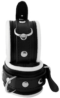 Handfessel aus robustem Leder. Farbe: weiss/schwarz. Innen mit weichem Leder gepolstert. D-Ring geschweißt. Handfessel: Länge: ca. 21 cm / Breite: ca. 5 cm.