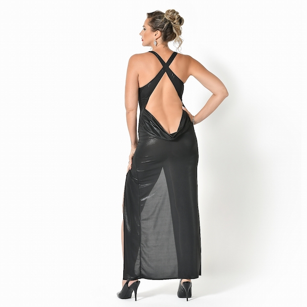 Wunderschönes beingeschlitztes Abendkleid mit Wasserfall-Ausschnitt im Rücken und transparentem Brustteil.