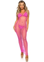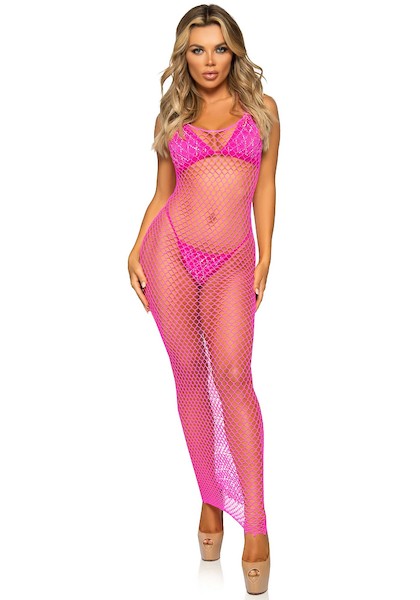 Rückenfreies Maxikleid aus Netz in Neonpink. UV-reaktiv. Ohne BH und Slip.
