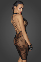 Mittellanges Tüllkleid mit gemusterter Flockstickerei und Samtträgern im Rücken, die perfekte Balance zwischen transparent und hot.