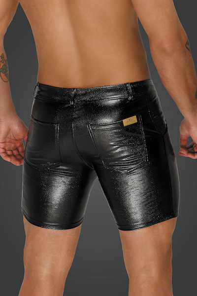 Klassische mittellange Herrenshorts aus Schlangen-Wetlook mit Knopf und Reißverschluss für bequemen Zugriff sowie zwei Gesäßtaschen.
