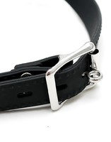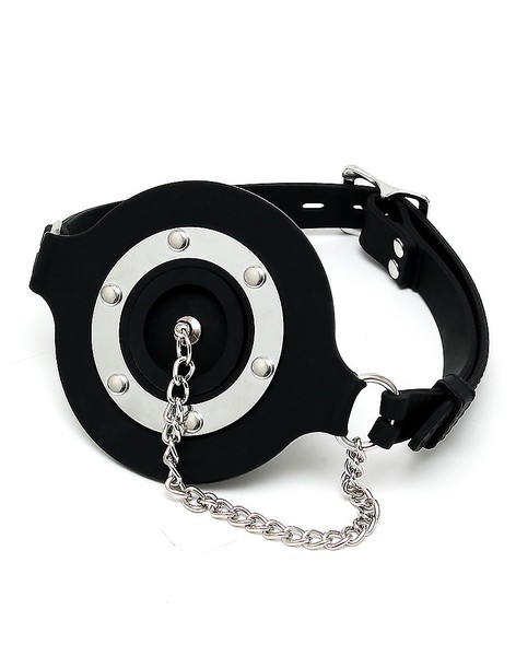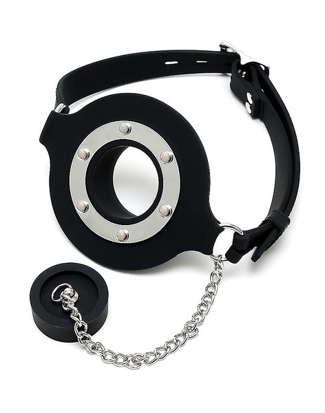 Schwarzer Mundknebel aus Samtsilikon mit Ringöffnung, die mit einem Stöpsel an einer Kette verschlossen werden kann. Der Verschluss ist mit einem Vorhängeschloss (nicht inklusive) abschließbar.