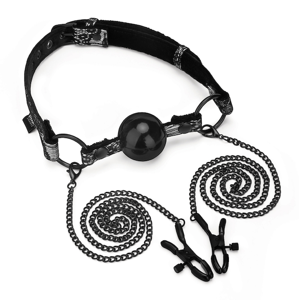 Silikonbeißball für eine festen Biss, verstellbarer Gürtel für angenehme Passform, einfach einstellbare Krokodilklemmen mit ummantelten Spitzen für hohen Tragekomfort und gegen die Brust baumelnde Metallketten für zusätzliche Stimulation, perfekt für fortgeschrittene Fesselspielchen. Gürtel (100% Polyester), Knebel (100% Silikon), Ringe & Nieten & Schnalle (100% nickelfreies Eisen), Klemmen & Ketten (100% nickelfreies Eisen), Spitzen-Ummantelung (100% Gummi)
