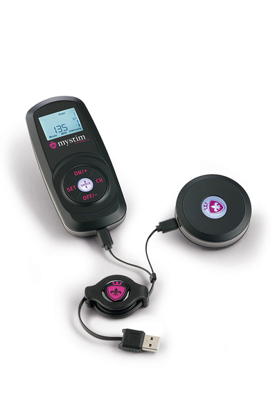 3) Der Shock-Button: Ein kurzer Druck auf den zentral liegenden runden Knopf erhöht die Intensität schlagartig auf das Maximum (Stufe 10) für drei Sekunden. Danach schaltet das System auf die vorher eingestellte Stufe zurück.
