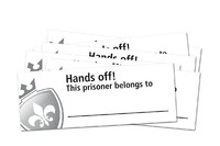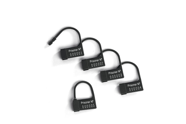 Ein passendes Metallschloss, in das das Mystim Wappen eingraviert ist, und ein Set von fünf Einweg-Siegeln aus Kunststoff stellen sicher, dass aus dem Pubic Enemy kein Entkommen ist. Und für vergessliche Subs gibt es einen Stapel Schilder mit dem Schriftzug „Hands off! This prisoner belongs to ___“, die in die Halterung des Peniskäfigs eingeschoben werden können – zur Erinnerung daran, wem der Käfiginhalt gehört.