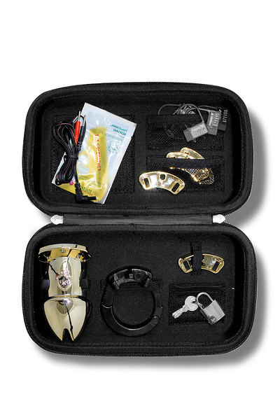 Mystims Pubic Enemy No 1 Gold Edition ist der weltweit erste und einzige Peniskäfig mit E-Stim-Funktion: Mit ihm wird ein aufmüpfiger Lümmel eingefangen und weggesperrt, so dass er nicht steif werden kann, bis der- oder diejenige mit dem Schlüssel ihn wieder freilässt. Mit den Leitflächen links und rechts im Käfig kann der Gefangene nach Lust und Laune mit Kribbeln, Zucken oder Pulsieren in genau der Intensität behandelt werden, die er sich verdient hat.