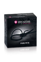 Für Puristen: Der Mystim Pure Pete klammert sich fest um den Eichelkranz und schickt kribbelnde oder stoßende Impulse zu dem schwarzen Silikonbogen, den er über die Penisspitze spannt – genau da, wo die ganz empfindlichen Stellen sitzen.