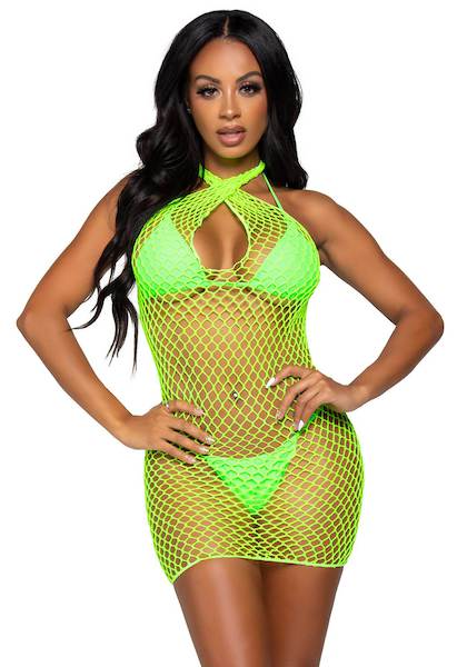 Scharfes neongrünes Netzkleid aus dehnfähigem Material.