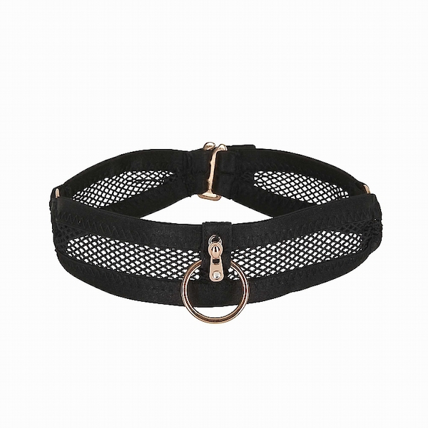 Wunderschönes Halsband aus schwarzem elastischem Netz mit rosegoldenem Ring und kleinem Schmuckstein.