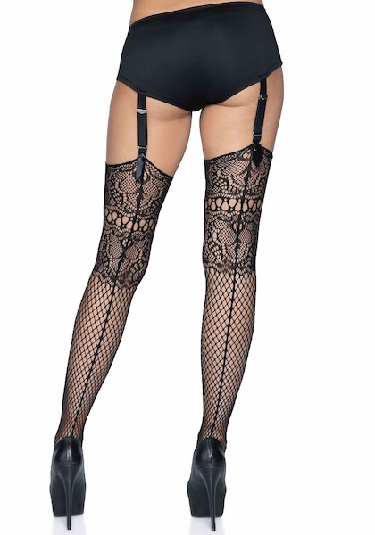Netzstrümpfe für einen Strumpfgürtel aus gemustertem Netz und hinterer Naht.