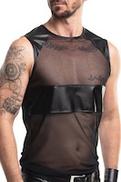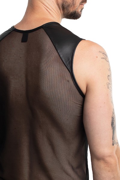 Modernes T-Shirt aus schwarzem Mesh-Material. Dekorative schwarze Einsätze im Wetlook befinden sich an Schultern und Brust. Das Mesh besticht durch drei herausragende Eigenschaften: Es fühlt sich weich an, ist hochelastisch und vor allem transparent. Dank dieser Transparenz können Sie Ihre muskulöse Figur, Tattoos oder Piercings perfekt zur Geltung bringen. Die Konstruktion betont die Breite der Schultern und betont die Form der freiliegenden Schultern und Arme.