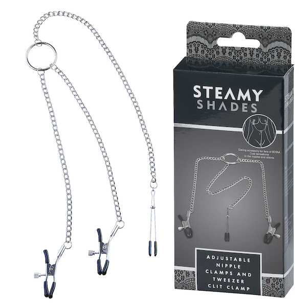 Brustwarzen- und Intimklemmen im Y-Stil, perfekt für die handfreie Stimulation, paarfreundlich, einstellbare Klemmen durch Schrauben und verschiebbaren Ring, ummantelte Spitzen für hohen Tragekomfort auch bei längeren Tragezeiten. Klemmen & Kette (100% nickelfreies Eisen); Spitzen-Ummantelung (100% Gummi)