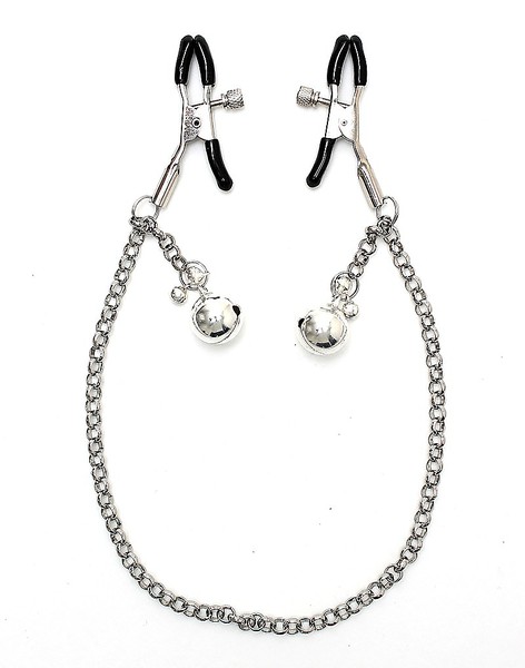 Diese Nippelklemmen sind mit einer Stellschraube versehen, um den Druck individuell verstellen zu können. Sie sind mit einer Kette verbunden und mit zwei Glöckchen versehen.