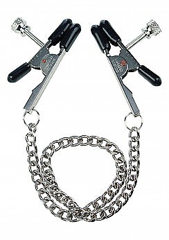 Mit diesen Nippelklemmen können Sie Ihr sensibles Subbi verwöhnen und ärgern. Die einfach zu bedienenden, voll verstellbaren Klemmen wurden für Ihre ultimative Freude entwickelt. Erleben Sie ein neues Maß an erotischen Empfindungen und genießen Sie ein längeres Nippelspiel mit den bequem zu tragenden Klammern. Anfänger und erfahrene Benutzer werden das intensive Orgasmus-Erlebnis lieben. Die Klemmen bestehen aus nicht anlaufendem nickelfreiem Metall und sind mit weichen, bequemen, phthalatfreien PVC-Pads und einfachen Drehschrauben ausgestattet. Die Mehrzweckklammern sind über eine robuste, hochwertige Kette befestigt, die für mehr sinnliche Erotik und vielseitige Stimulation sorgt. Die Klemmen haben ein diskretes Maß von 5 cm und sind für seine und ihre persönliche Zufriedenheit geeignet. Um die Empfindlichkeit zu erhöhen, können die Klemmen mit einem aushärtenden Erregungsgel oder einem Qualitätsschmiermittel verwendet werden. Die verstellbaren Klemmen lassen sich leicht an den Brustwarzen befestigen und können auch an anderen überempfindlichen Stellen des Körpers verwendet werden. Öffnen Sie die Klemmen durch Drücken und setzen Sie sie direkt auf den Nippel, bevor Sie die Klemmen lösen. Die angenehmen Empfindungen werden durch das Gewicht der nickelfreien Eisenkette verstärkt.