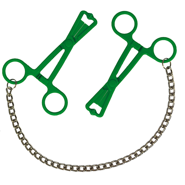 Brustklammern aus Kunststoff, wie eine Schere, mit Kette ,