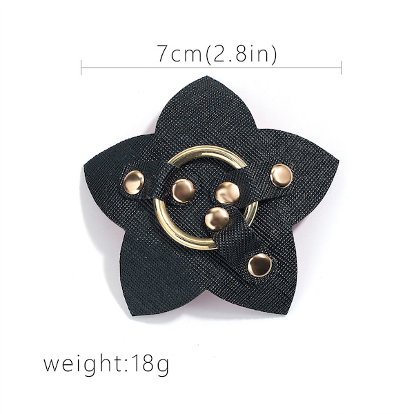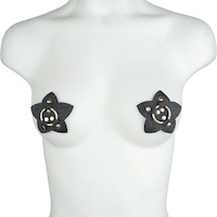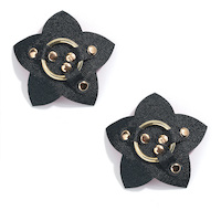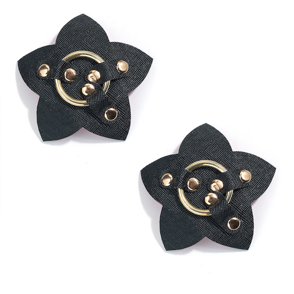 Schwarze Nippelaufkleber in Blumenform mit goldenem Ring und Nieten. Selbstklebend