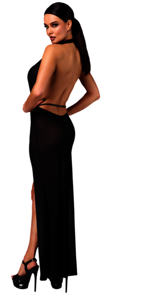 Design: Der weiche, drapierte Wasserfallausschnitt, der um den Hals gebunden wird, enthüllt elegant die Schultern. Der offene Rücken mit einem funkelnden Strassband zieht die Blicke auf sich, während ein tiefer Schlitz vorne das Bein betont und eine markante, fließende Silhouette schafft.