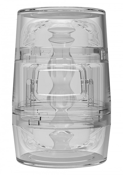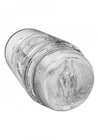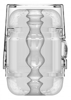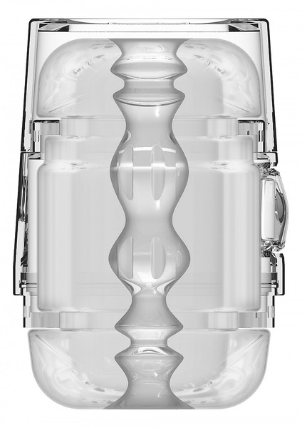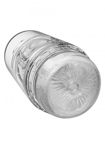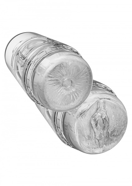 Durchsichtiger zweiseitiger Eichelmasturbator mit Anus- und Vaginalseite. Seitlich eindrückbar für ein enges Gefühl.