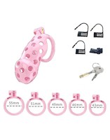 Die P-Cage-Kollektion von Rimba Toys umfasst verschiedene Arten von Peniskäfigen. Aus hochwertigem ABS-Material gefertigt, bieten diese Keuschheitskäfige einen bequemen Sitz und gewährleisten eine lange Haltbarkeit. Ein Keuschheitskäfig hindert den Träger daran, eine Erektion zu bekommen. Die Öffnung an der Vorderseite jedes P-Käfigs ermöglicht es dem Träger, zu urinieren, ohne den Käfig zu entfernen. Dieses Peniskäfig-Set enthält 5 Ringe in verschiedenen Größen (zwischen 43 und 55 mm). Außerdem enthält es 1 eingebautes Kupferschloss und 3 nummerierte Vorhängeschlösser aus Kunststoff. Die Plastikschlösser können nach einmaligem Gebrauch mit einer Schere abgeschnitten werden. Als Alternative zu den Kupfer-Einbauschlössern sind zwei Kunststoffschrauben enthalten, die möglicherweise nicht durch die Sicherheitskontrollen am Flughafen passen, während die Kunststoffschlösser flughafentauglich sind.