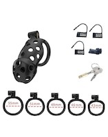 Die P-Cage-Kollektion von Rimba Toys umfasst verschiedene Arten von Peniskäfigen. Aus hochwertigem ABS-Material gefertigt, bieten diese Keuschheitskäfige einen bequemen Sitz und gewährleisten eine lange Haltbarkeit. Ein Keuschheitskäfig hindert den Träger daran, eine Erektion zu bekommen. Die Öffnung an der Vorderseite jedes P-Käfigs ermöglicht es dem Träger, zu urinieren, ohne den Käfig zu entfernen. Dieses Peniskäfig-Set enthält 5 Ringe in verschiedenen Größen (zwischen 43 und 55 mm). Außerdem enthält es 1 eingebautes Kupferschloss und 3 nummerierte Vorhängeschlösser aus Kunststoff. Die Plastikschlösser können nach einmaligem Gebrauch mit einer Schere abgeschnitten werden. Als Alternative zu den Kupfer-Einbauschlössern sind zwei Kunststoffschrauben enthalten, die möglicherweise nicht durch die Sicherheitskontrollen am Flughafen passen, während die Kunststoffschlösser flughafentauglich sind.