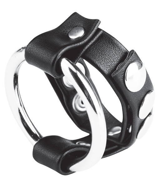 Dieser Cockring aus Metall mit verstellbarer Lederschlaufe wurde entworfen um Erektionen zu verlängern. Die verstellbare Lederschlaufe umschließt Penis und Hoden während der Penis durch den Metallring umfasst wird.