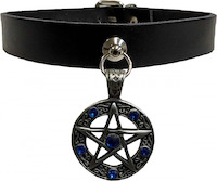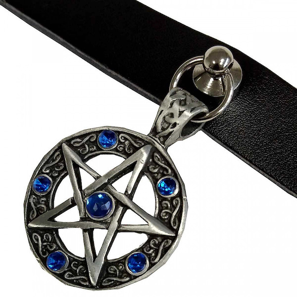 Material: Leder, Metall und Zinn Breite: ca. 1,9 cm Gesamtlänge: ca. 45 cm Pentagramm: ca. 3 cm x 3 cm Farbe: Schwarz / Blau
