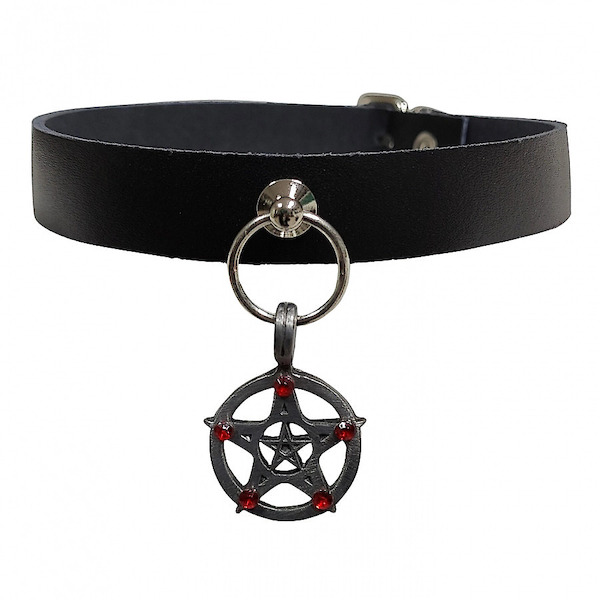 Material: Leder, Metall und Zinn Breite: ca. 1,9 cm Gesamtlänge: ca. 45 cm Pentagramm: ca. 2,5 cm x 2,5 cm Farbe: Schwarz & Rot